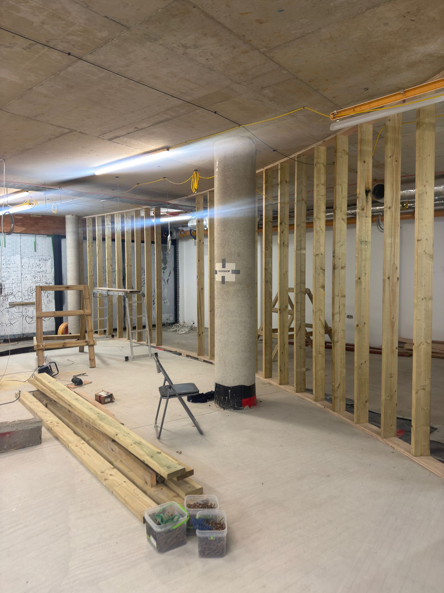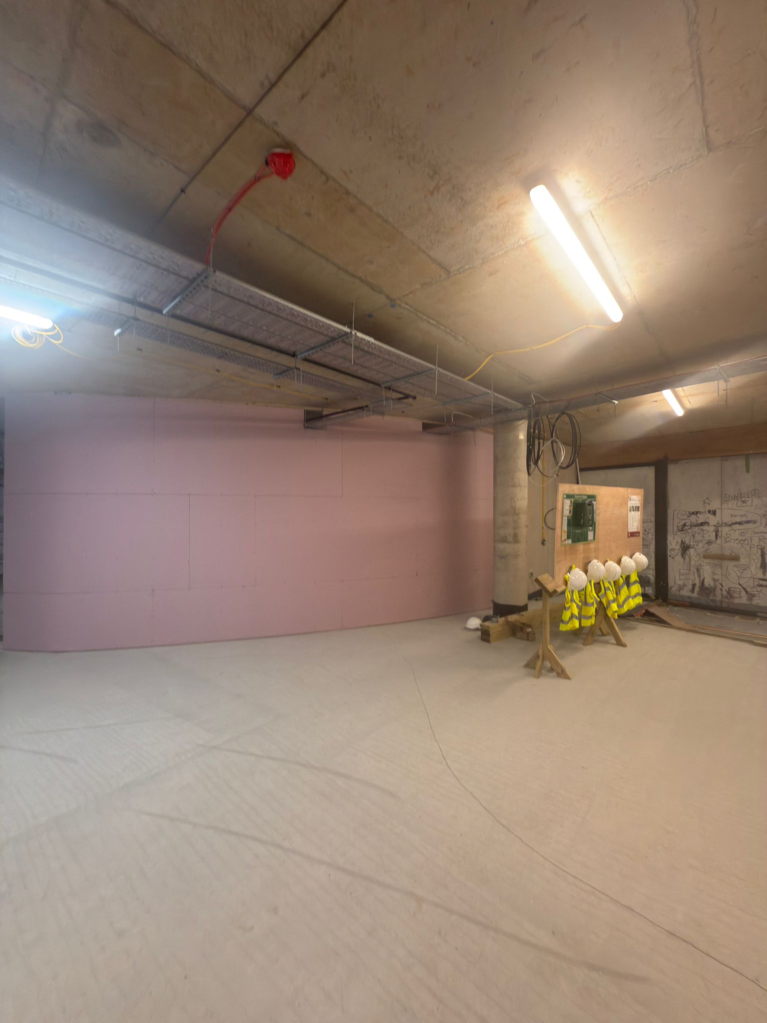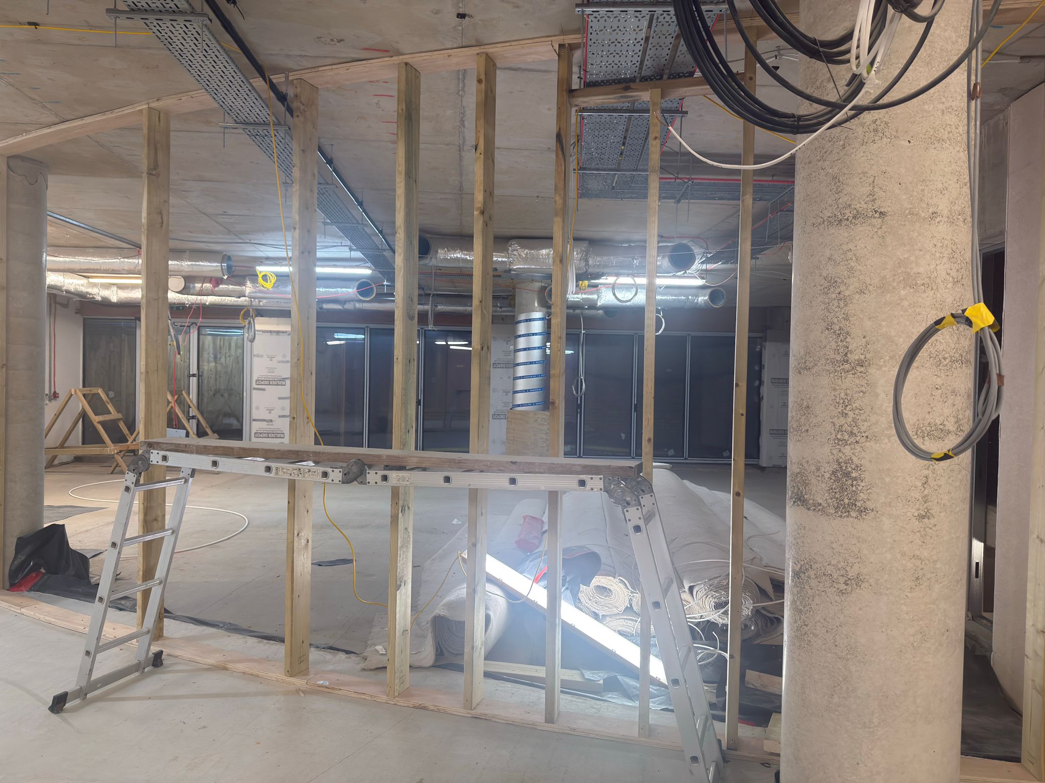 Café and reception undergoing temporary lighting installation in preparation for brick walls