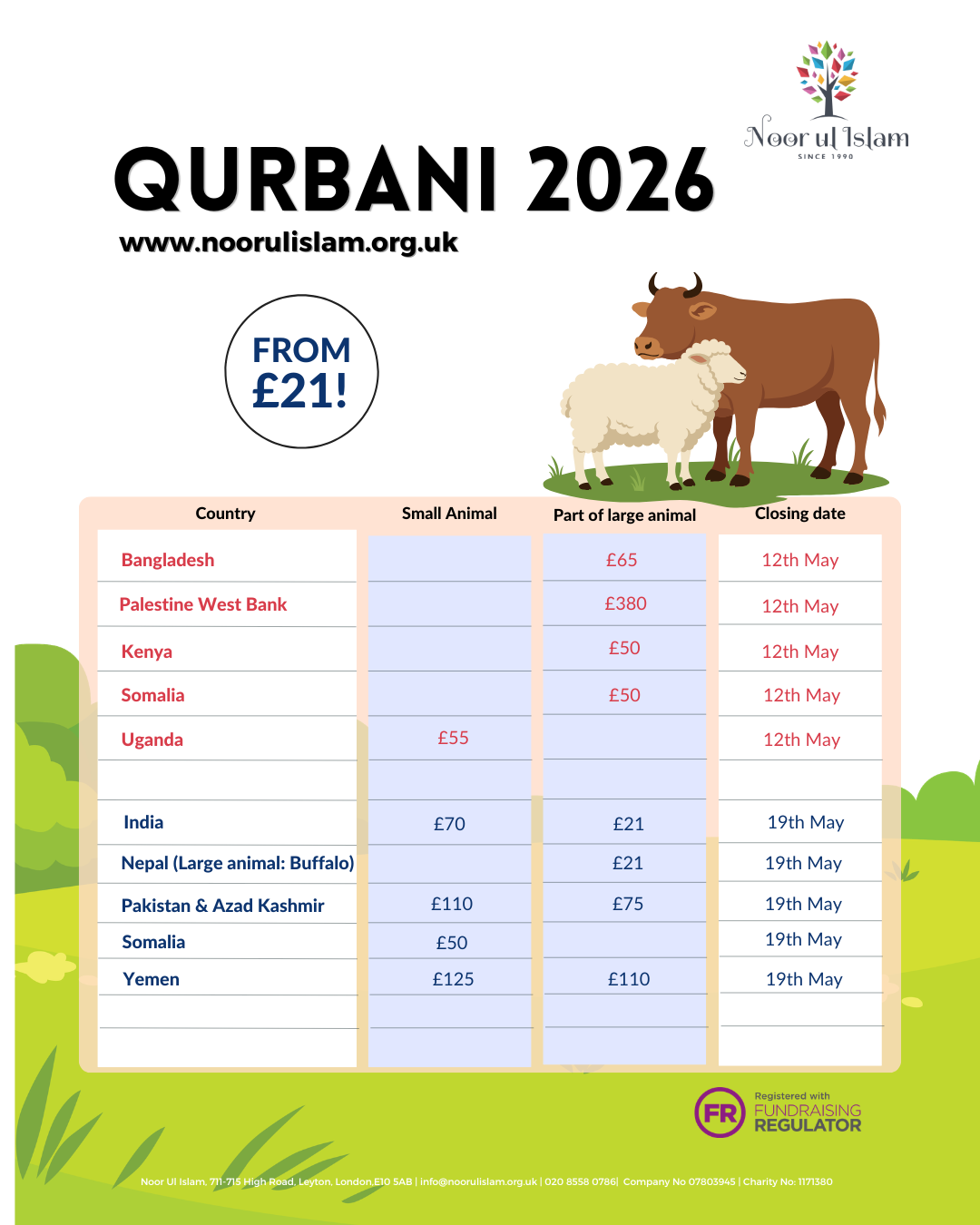 You can book your Qurbani with Noor Ul Islam for meat to be distributed to the poor and needy.